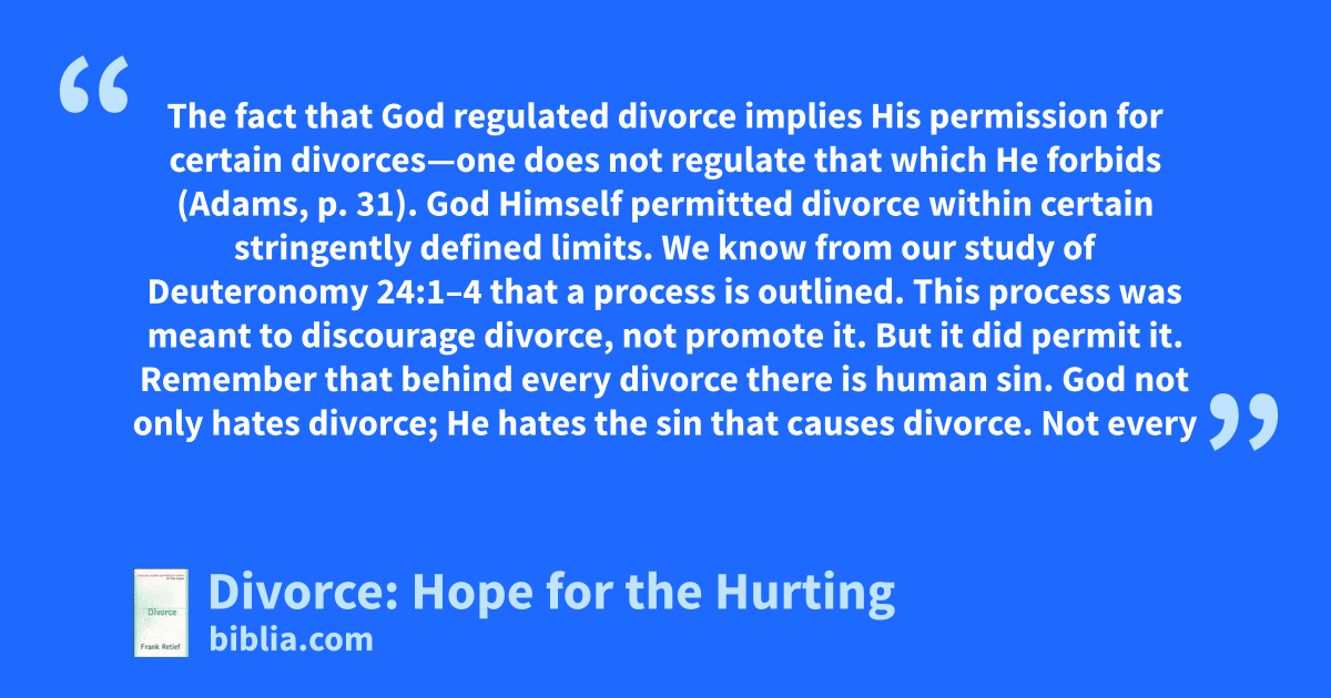 The fact that God regulated divorce implies His permission for certain divorces—one does not regulate that which He forbids (Adams, p. 31). God Himself permitted divorce within certain stringently defined limits. We know from our study of Deuteronomy 24:1–4 that a process is outlined. This process was meant to discourage divorce, not promote it. But it did permit it. Remember that behind every divorce there is human sin. God not only hates divorce; He hates the sin that causes divorce. Not every
