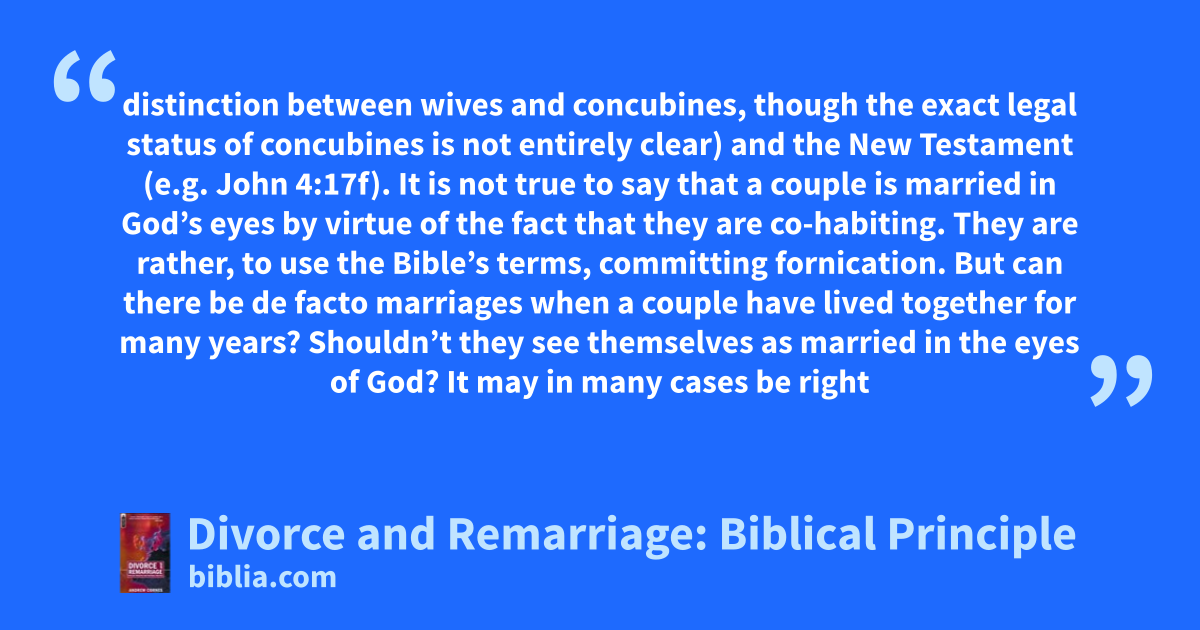 distinction between wives and concubines, though the exact legal status of concubines is not entirely clear) and the New Testament (e.g. John 4:17f). It is not true to say that a couple is married in God’s eyes by virtue of the fact that they are co-habiting. They are rather, to use the Bible’s terms, committing fornication. But can there be de facto marriages when a couple have lived together for many years? Shouldn’t they see themselves as married in the eyes of God? It may in many cases be right