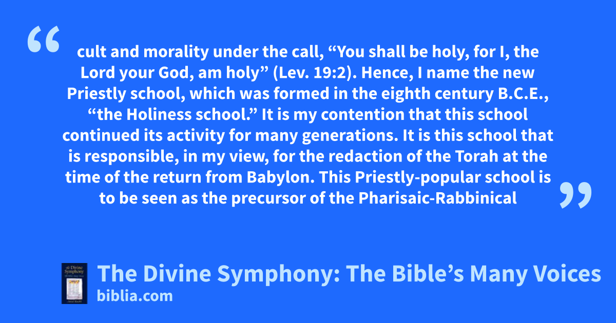 cult and morality under the call, “You shall be holy, for I, the Lord your God, am holy” (Lev. 19:2). Hence, I name the new Priestly school, which was formed in the eighth century B.C.E., “the Holiness school.” It is my contention that this school continued its activity for many generations. It is this school that is responsible, in my view, for the redaction of the Torah at the time of the return from Babylon. This Priestly-popular school is to be seen as the precursor of the Pharisaic-Rabbinical