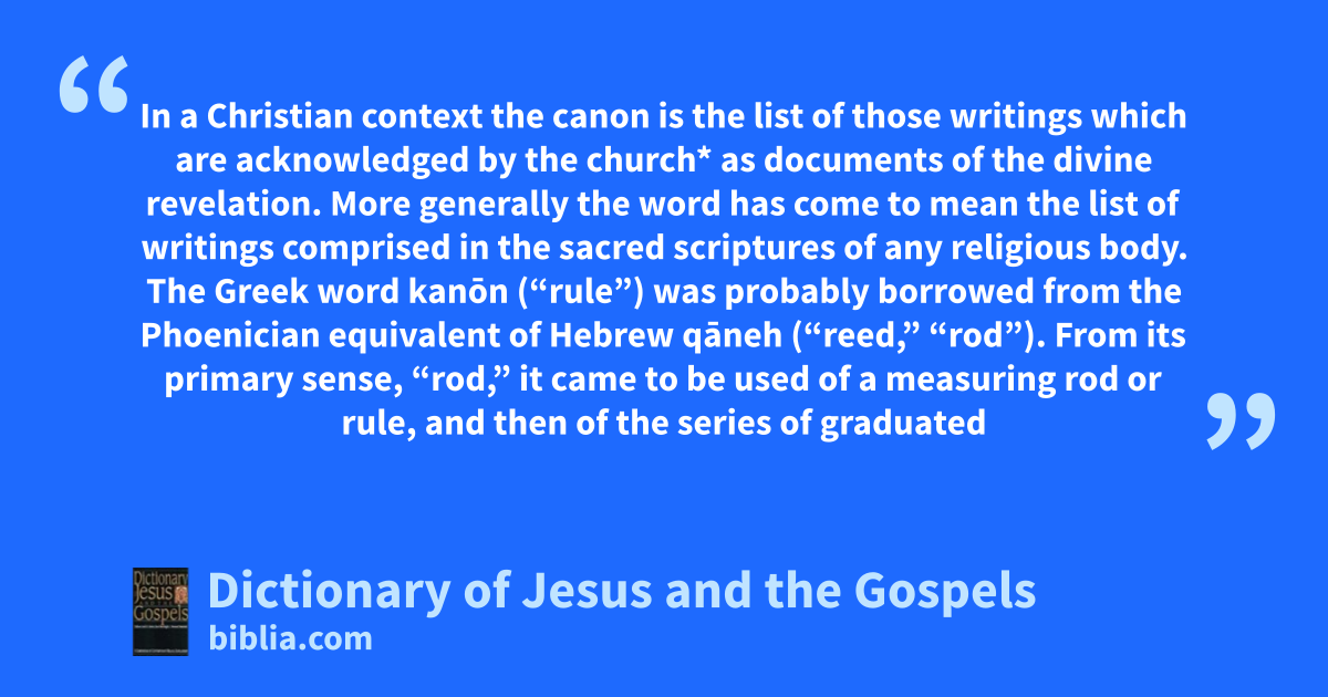 In a Christian context the canon is the list of those writings which are acknowledged by the church* as documents of the divine revelation. More generally the word has come to mean the list of writings comprised in the sacred scriptures of any religious body. The Greek word kanōn (“rule”) was probably borrowed from the Phoenician equivalent of Hebrew qāneh (“reed,” “rod”). From its primary sense, “rod,” it came to be used of a measuring rod or rule, and then of the series of graduated