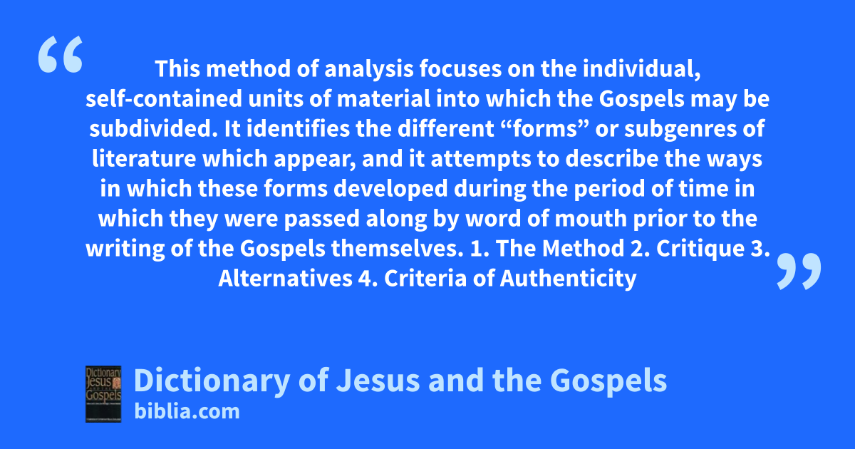 This method of analysis focuses on the individual, self-contained units of material into which the Gospels may be subdivided. It identifies the different “forms” or subgenres of literature which appear, and it attempts to describe the ways in which these forms developed during the period of time in which they were passed along by word of mouth prior to the writing of the Gospels themselves. 1. The Method 2. Critique 3. Alternatives 4. Criteria of Authenticity