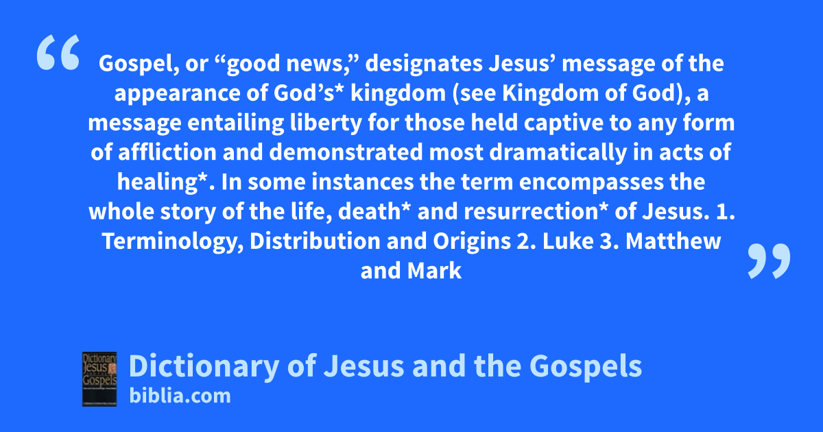 Gospel, or “good news,” designates Jesus’ message of the appearance of God’s* kingdom (see Kingdom of God), a message entailing liberty for those held captive to any form of affliction and demonstrated most dramatically in acts of healing*. In some instances the term encompasses the whole story of the life, death* and resurrection* of Jesus. 1. Terminology, Distribution and Origins 2. Luke 3. Matthew and Mark