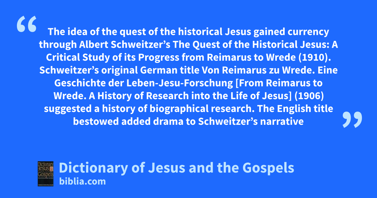 The idea of the quest of the historical Jesus gained currency through Albert Schweitzer’s The Quest of the Historical Jesus: A Critical Study of its Progress from Reimarus to Wrede (1910). Schweitzer’s original German title Von Reimarus zu Wrede. Eine Geschichte der Leben-Jesu-Forschung [From Reimarus to Wrede. A History of Research into the Life of Jesus] (1906) suggested a history of biographical research. The English title bestowed added drama to Schweitzer’s narrative