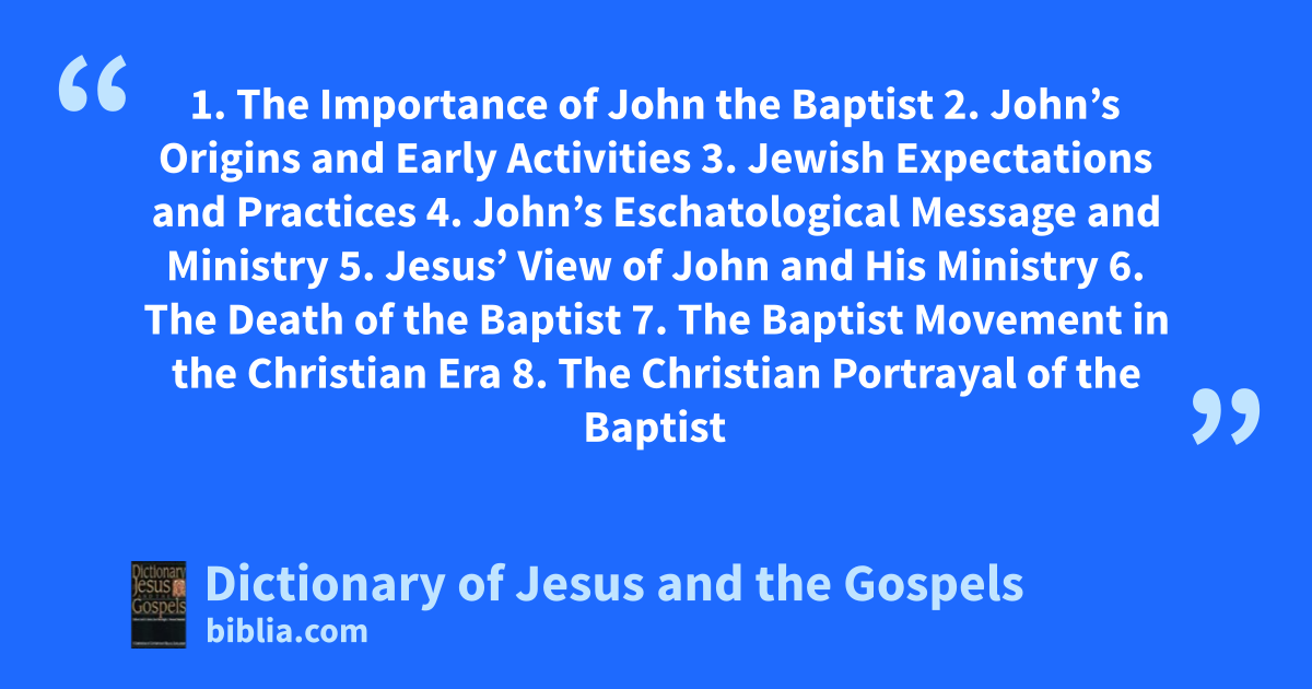 1. The Importance of John the Baptist 2. John’s Origins and Early Activities 3. Jewish Expectations and Practices 4. John’s Eschatological Message and Ministry 5. Jesus’ View of John and His Ministry 6. The Death of the Baptist 7. The Baptist Movement in the Christian Era 8. The Christian Portrayal of the Baptist