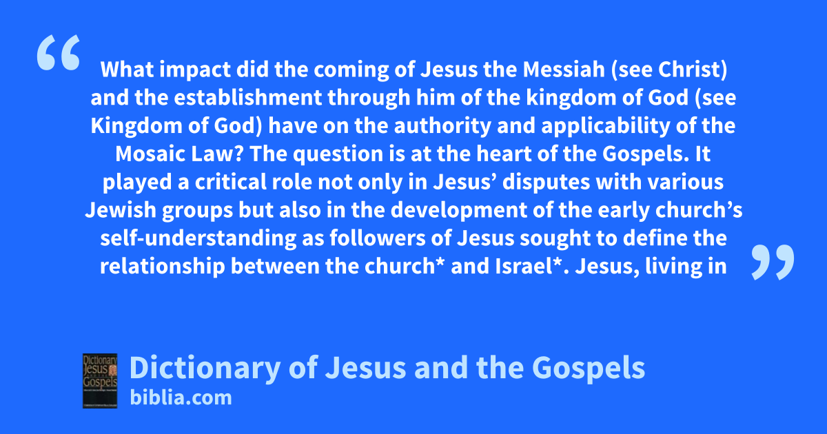 What impact did the coming of Jesus the Messiah (see Christ) and the establishment through him of the kingdom of God (see Kingdom of God) have on the authority and applicability of the Mosaic Law? The question is at the heart of the Gospels. It played a critical role not only in Jesus’ disputes with various Jewish groups but also in the development of the early church’s self-understanding as followers of Jesus sought to define the relationship between the church* and Israel*. Jesus, living in