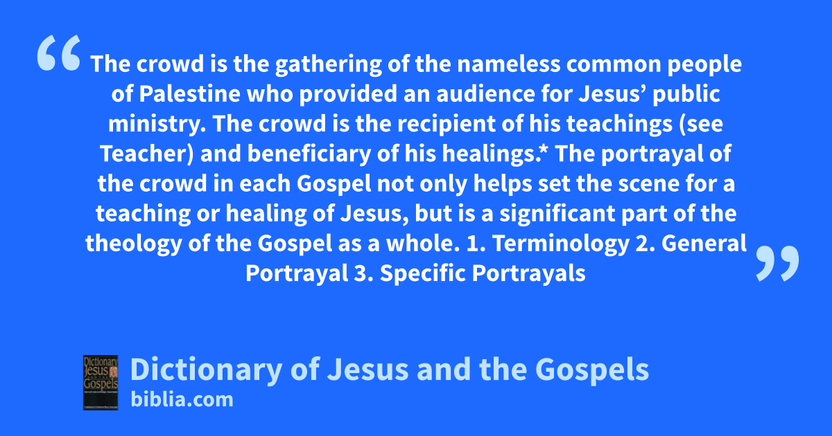The crowd is the gathering of the nameless common people of Palestine who provided an audience for Jesus’ public ministry. The crowd is the recipient of his teachings (see Teacher) and beneficiary of his healings.* The portrayal of the crowd in each Gospel not only helps set the scene for a teaching or healing of Jesus, but is a significant part of the theology of the Gospel as a whole. 1. Terminology 2. General Portrayal 3. Specific Portrayals