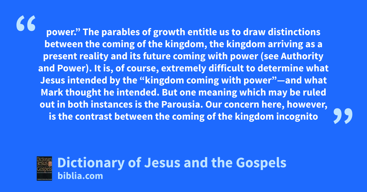 power.” The parables of growth entitle us to draw distinctions between the coming of the kingdom, the kingdom arriving as a present reality and its future coming with power (see Authority and Power). It is, of course, extremely difficult to determine what Jesus intended by the “kingdom coming with power”—and what Mark thought he intended. But one meaning which may be ruled out in both instances is the Parousia. Our concern here, however, is the contrast between the coming of the kingdom incognito
