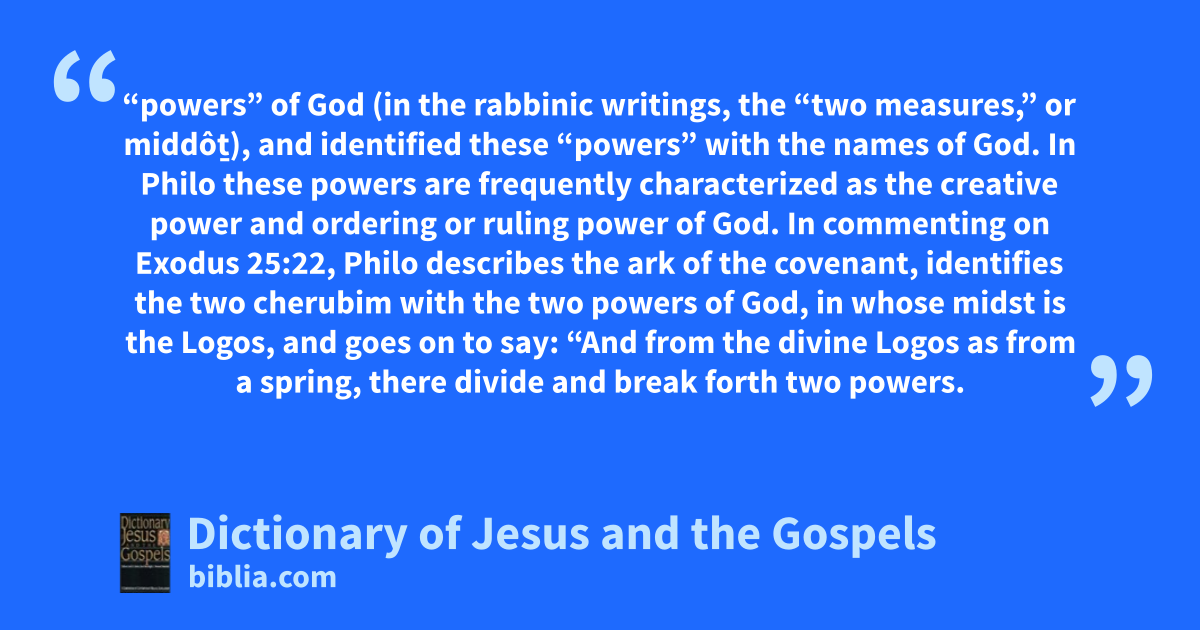 “powers” of God (in the rabbinic writings, the “two measures,” or middôṯ), and identified these “powers” with the names of God. In Philo these powers are frequently characterized as the creative power and ordering or ruling power of God. In commenting on Exodus 25:22, Philo describes the ark of the covenant, identifies the two cherubim with the two powers of God, in whose midst is the Logos, and goes on to say: “And from the divine Logos as from a spring, there divide and break forth two powers.