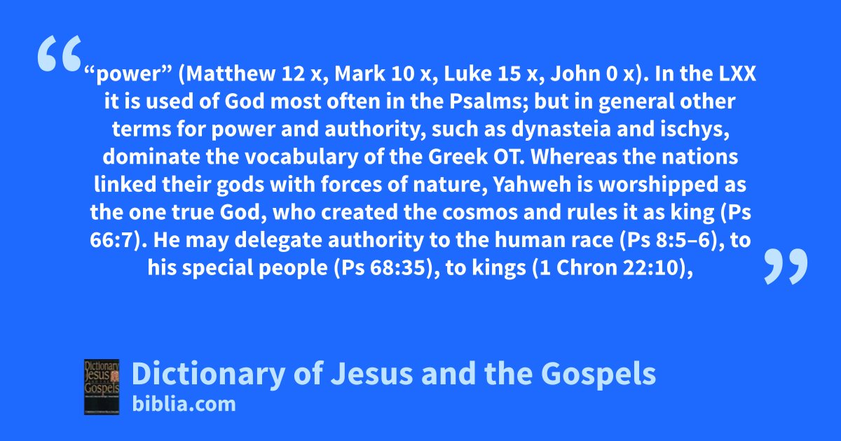 “power” (Matthew 12 x, Mark 10 x, Luke 15 x, John 0 x). In the LXX it is used of God most often in the Psalms; but in general other terms for power and authority, such as dynasteia and ischys, dominate the vocabulary of the Greek OT. Whereas the nations linked their gods with forces of nature, Yahweh is worshipped as the one true God, who created the cosmos and rules it as king (Ps 66:7). He may delegate authority to the human race (Ps 8:5–6), to his special people (Ps 68:35), to kings (1 Chron 22:10),