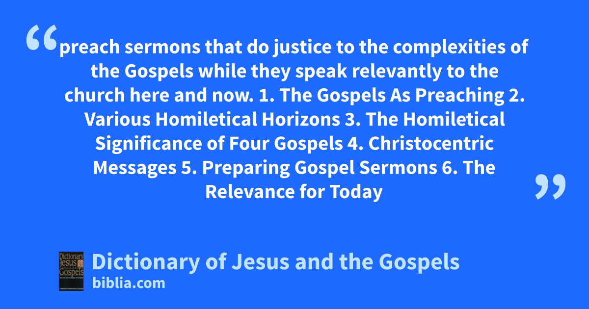 preach sermons that do justice to the complexities of the Gospels while they speak relevantly to the church here and now. 1. The Gospels As Preaching 2. Various Homiletical Horizons 3. The Homiletical Significance of Four Gospels 4. Christocentric Messages 5. Preparing Gospel Sermons 6. The Relevance for Today