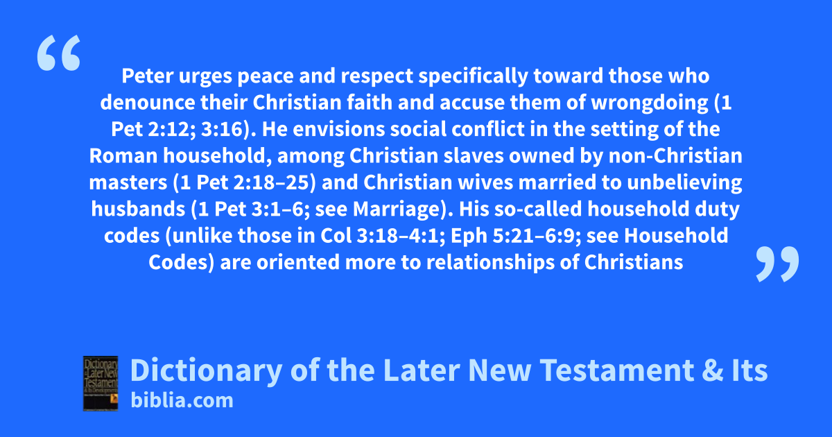 Peter urges peace and respect specifically toward those who denounce their Christian faith and accuse them of wrongdoing (1 Pet 2:12; 3:16). He envisions social conflict in the setting of the Roman household, among Christian slaves owned by non-Christian masters (1 Pet 2:18–25) and Christian wives married to unbelieving husbands (1 Pet 3:1–6; see Marriage). His so-called household duty codes (unlike those in Col 3:18–4:1; Eph 5:21–6:9; see Household Codes) are oriented more to relationships of Christians
