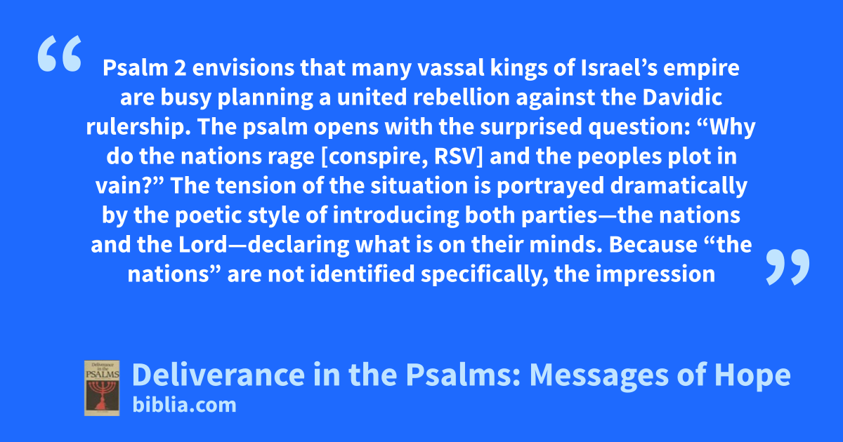 Psalm 2 envisions that many vassal kings of Israel’s empire are busy planning a united rebellion against the Davidic rulership. The psalm opens with the surprised question: “Why do the nations rage [conspire, RSV] and the peoples plot in vain?” The tension of the situation is portrayed dramatically by the poetic style of introducing both parties—the nations and the Lord—declaring what is on their minds. Because “the nations” are not identified specifically, the impression