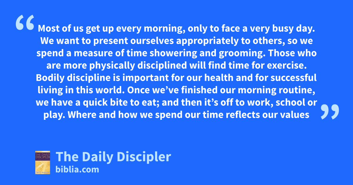 Most of us get up every morning, only to face a very busy day. We want to present ourselves appropriately to others, so we spend a measure of time showering and grooming. Those who are more physically disciplined will find time for exercise. Bodily discipline is important for our health and for successful living in this world. Once we’ve finished our morning routine, we have a quick bite to eat; and then it’s off to work, school or play. Where and how we spend our time reflects our values
