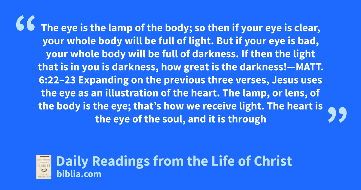 The eye is the lamp of the body; so then if your eye is clear, your whole body will be full of light. But if your eye is bad, your whole body will be full of darkness. If then the light that is in you is darkness, how great is the darkness!—MATT. 6:22–23 Expanding on the previous three verses, Jesus uses the eye as an illustration of the heart. The lamp, or lens, of the body is the eye; that’s how we receive light. The heart is the eye of the soul, and it is through