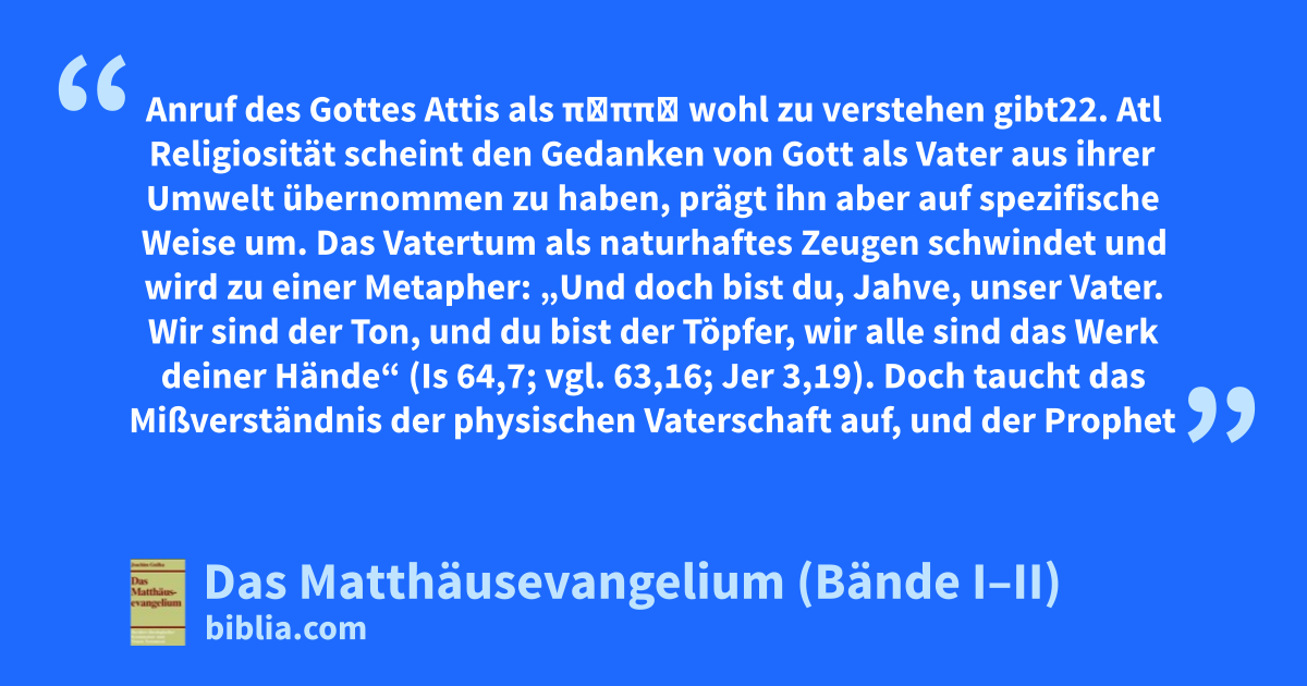 Anruf des Gottes Attis als πάππα wohl zu verstehen gibt22. Atl Religiosität scheint den Gedanken von Gott als Vater aus ihrer Umwelt übernommen zu haben, prägt ihn aber auf spezifische Weise um. Das Vatertum als naturhaftes Zeugen schwindet und wird zu einer Metapher: „Und doch bist du, Jahve, unser Vater. Wir sind der Ton, und du bist der Töpfer, wir alle sind das Werk deiner Hände“ (Is 64,7; vgl. 63,16; Jer 3,19). Doch taucht das Mißverständnis der physischen Vaterschaft auf, und der Prophet