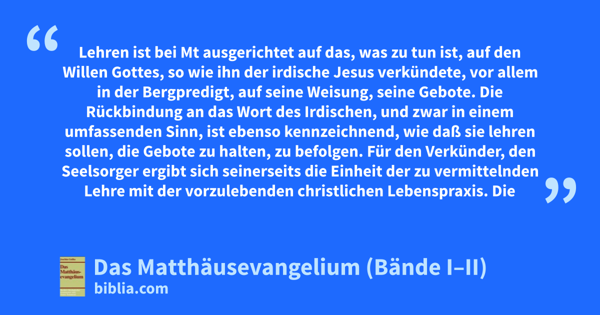 Lehren ist bei Mt ausgerichtet auf das, was zu tun ist, auf den Willen Gottes, so wie ihn der irdische Jesus verkündete, vor allem in der Bergpredigt, auf seine Weisung, seine Gebote. Die Rückbindung an das Wort des Irdischen, und zwar in einem umfassenden Sinn, ist ebenso kennzeichnend, wie daß sie lehren sollen, die Gebote zu halten, zu befolgen. Für den Verkünder, den Seelsorger ergibt sich seinerseits die Einheit der zu vermittelnden Lehre mit der vorzulebenden christlichen Lebenspraxis. Die