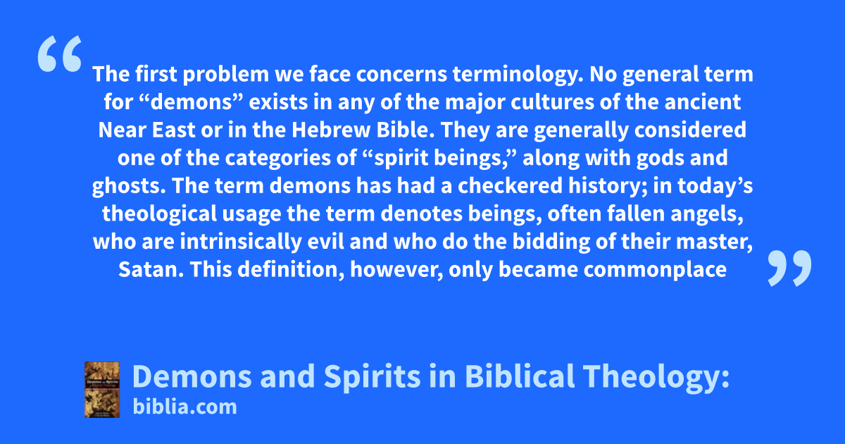 The first problem we face concerns terminology. No general term for “demons” exists in any of the major cultures of the ancient Near East or in the Hebrew Bible. They are generally considered one of the categories of “spirit beings,” along with gods and ghosts. The term demons has had a checkered history; in today’s theological usage the term denotes beings, often fallen angels, who are intrinsically evil and who do the bidding of their master, Satan. This definition, however, only became commonplace