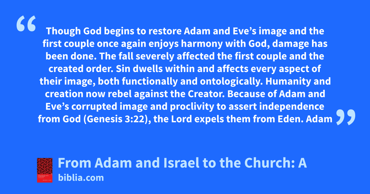 Though God begins to restore Adam and Eve’s image and the first couple once again enjoys harmony with God, damage has been done. The fall severely affected the first couple and the created order. Sin dwells within and affects every aspect of their image, both functionally and ontologically. Humanity and creation now rebel against the Creator. Because of Adam and Eve’s corrupted image and proclivity to assert independence from God (Genesis 3:22), the Lord expels them from Eden. Adam