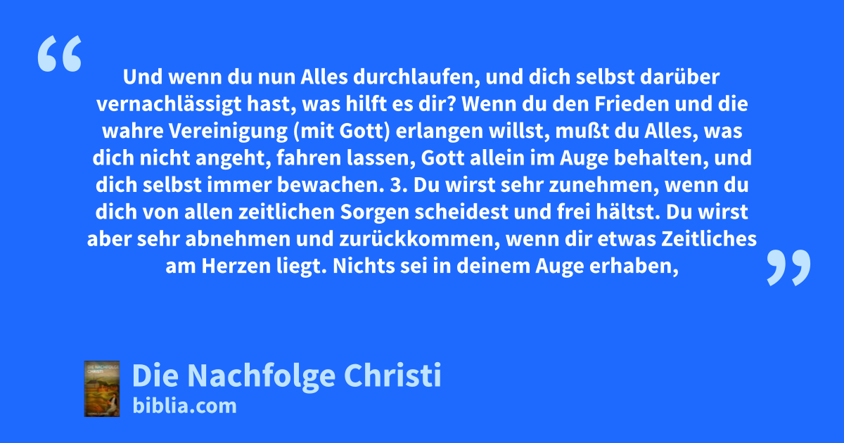 Und wenn du nun Alles durchlaufen, und dich selbst darüber vernachlässigt hast, was hilft es dir? Wenn du den Frieden und die wahre Vereinigung (mit Gott) erlangen willst, mußt du Alles, was dich nicht angeht, fahren lassen, Gott allein im Auge behalten, und dich selbst immer bewachen. 3. Du wirst sehr zunehmen, wenn du dich von allen zeitlichen Sorgen scheidest und frei hältst. Du wirst aber sehr abnehmen und zurückkommen, wenn dir etwas Zeitliches am Herzen liegt. Nichts sei in deinem Auge erhaben,