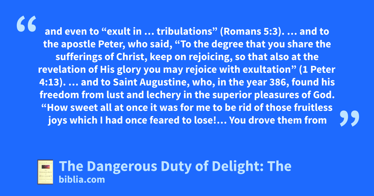 and even to “exult in … tribulations” (Romans 5:3). … and to the apostle Peter, who said, “To the degree that you share the sufferings of Christ, keep on rejoicing, so that also at the revelation of His glory you may rejoice with exultation” (1 Peter 4:13). … and to Saint Augustine, who, in the year 386, found his freedom from lust and lechery in the superior pleasures of God. “How sweet all at once it was for me to be rid of those fruitless joys which I had once feared to lose!… You drove them from