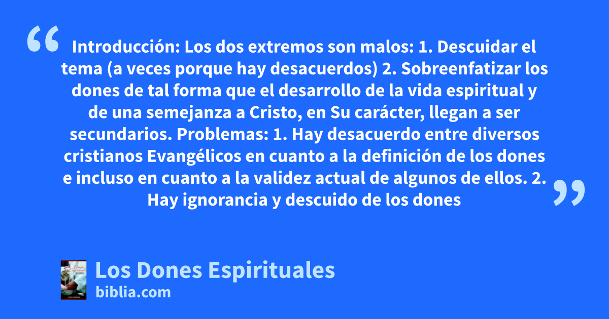 Introducción: Los dos extremos son malos: 1. Descuidar el tema (a veces porque hay desacuerdos) 2. Sobreenfatizar los dones de tal forma que el desarrollo de la vida espiritual y de una semejanza a Cristo, en Su carácter, llegan a ser secundarios. Problemas: 1. Hay desacuerdo entre diversos cristianos Evangélicos en cuanto a la definición de los dones e incluso en cuanto a la validez actual de algunos de ellos. 2. Hay ignorancia y descuido de los dones