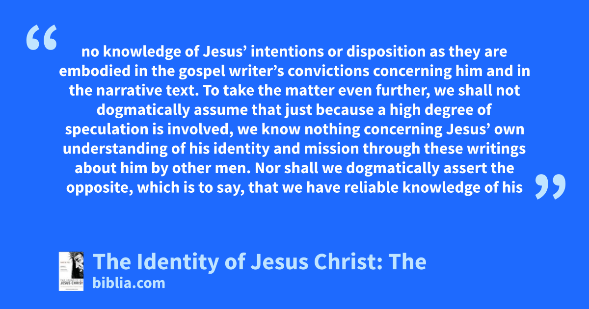 no knowledge of Jesus’ intentions or disposition as they are embodied in the gospel writer’s convictions concerning him and in the narrative text. To take the matter even further, we shall not dogmatically assume that just because a high degree of speculation is involved, we know nothing concerning Jesus’ own understanding of his identity and mission through these writings about him by other men. Nor shall we dogmatically assert the opposite, which is to say, that we have reliable knowledge of his