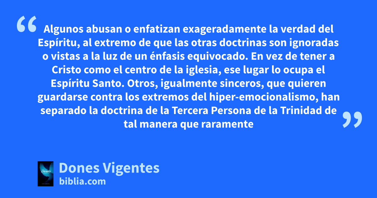 Algunos abusan o enfatizan exageradamente la verdad del Espíritu, al extremo de que las otras doctrinas son ignoradas o vistas a la luz de un énfasis equivocado. En vez de tener a Cristo como el centro de la iglesia, ese lugar lo ocupa el Espíritu Santo. Otros, igualmente sinceros, que quieren guardarse contra los extremos del hiper-emocionalismo, han separado la doctrina de la Tercera Persona de la Trinidad de tal manera que raramente
