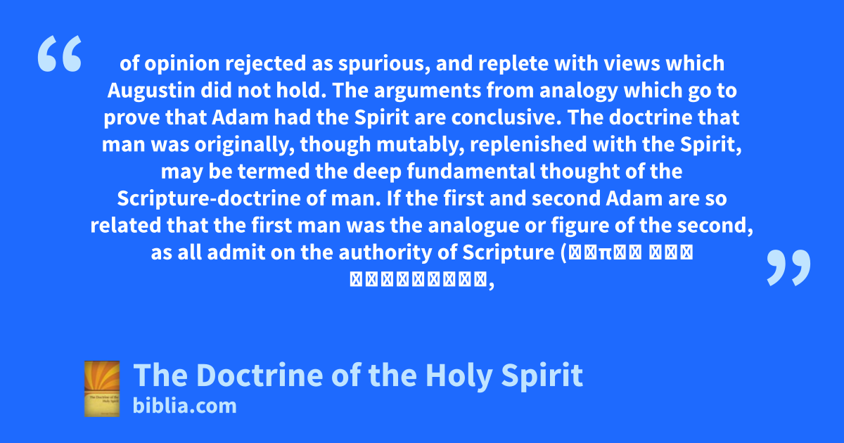 of opinion rejected as spurious, and replete with views which Augustin did not hold. The arguments from analogy which go to prove that Adam had the Spirit are conclusive. The doctrine that man was originally, though mutably, replenished with the Spirit, may be termed the deep fundamental thought of the Scripture-doctrine of man. If the first and second Adam are so related that the first man was the analogue or figure of the second, as all admit on the authority of Scripture (τύπος τοῦ μέλλοντος,
