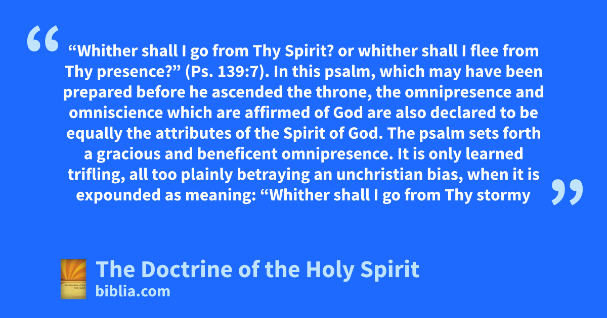 “Whither shall I go from Thy Spirit? or whither shall I flee from Thy presence?” (Ps. 139:7). In this psalm, which may have been prepared before he ascended the throne, the omnipresence and omniscience which are affirmed of God are also declared to be equally the attributes of the Spirit of God. The psalm sets forth a gracious and beneficent omnipresence. It is only learned trifling, all too plainly betraying an unchristian bias, when it is expounded as meaning: “Whither shall I go from Thy stormy