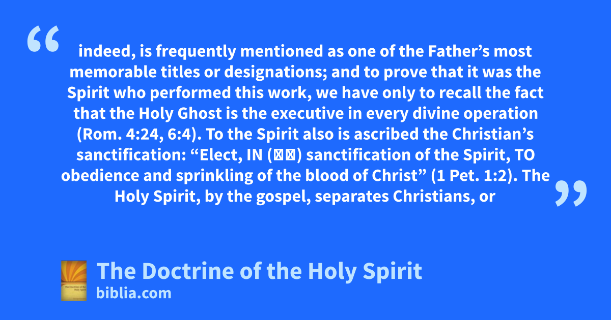 indeed, is frequently mentioned as one of the Father’s most memorable titles or designations; and to prove that it was the Spirit who performed this work, we have only to recall the fact that the Holy Ghost is the executive in every divine operation (Rom. 4:24, 6:4). To the Spirit also is ascribed the Christian’s sanctification: “Elect, IN (ἐν) sanctification of the Spirit, TO obedience and sprinkling of the blood of Christ” (1 Pet. 1:2). The Holy Spirit, by the gospel, separates Christians, or