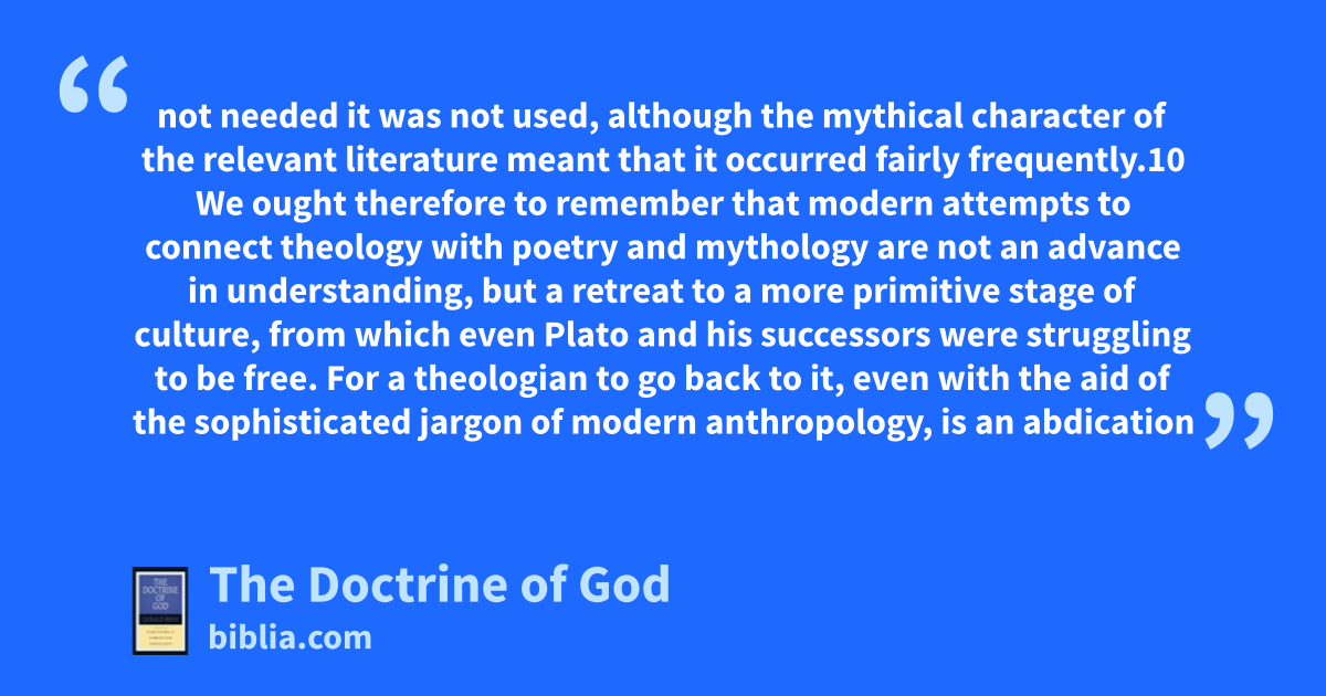 not needed it was not used, although the mythical character of the relevant literature meant that it occurred fairly frequently.10 We ought therefore to remember that modern attempts to connect theology with poetry and mythology are not an advance in understanding, but a retreat to a more primitive stage of culture, from which even Plato and his successors were struggling to be free. For a theologian to go back to it, even with the aid of the sophisticated jargon of modern anthropology, is an abdication