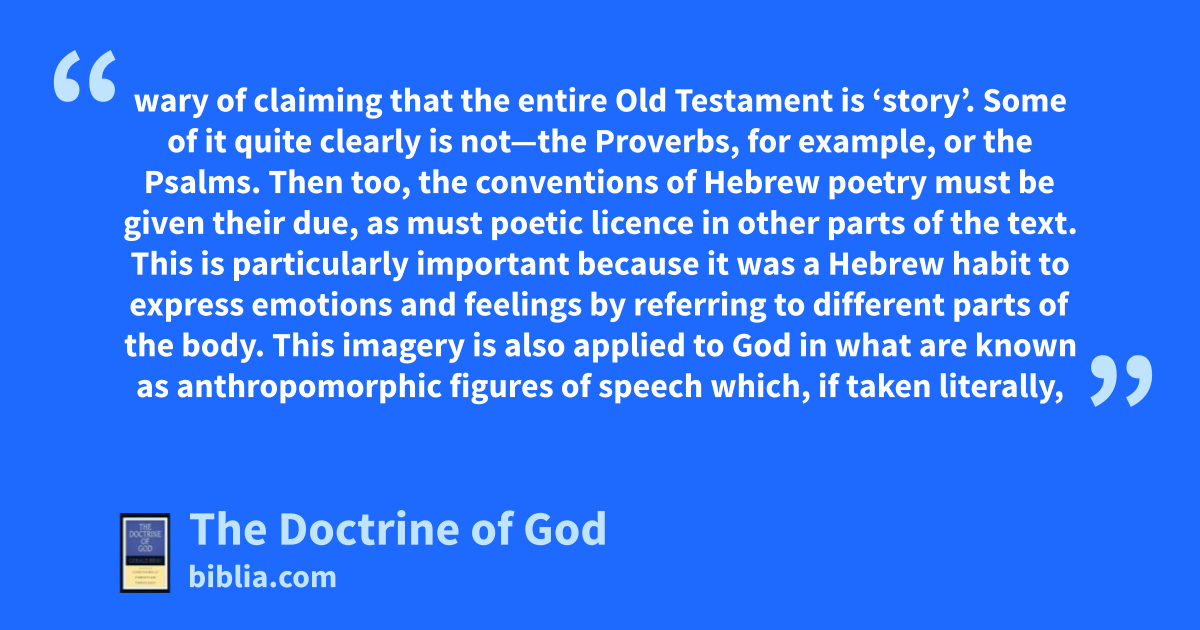 wary of claiming that the entire Old Testament is ‘story’. Some of it quite clearly is not—the Proverbs, for example, or the Psalms. Then too, the conventions of Hebrew poetry must be given their due, as must poetic licence in other parts of the text. This is particularly important because it was a Hebrew habit to express emotions and feelings by referring to different parts of the body. This imagery is also applied to God in what are known as anthropomorphic figures of speech which, if taken literally,