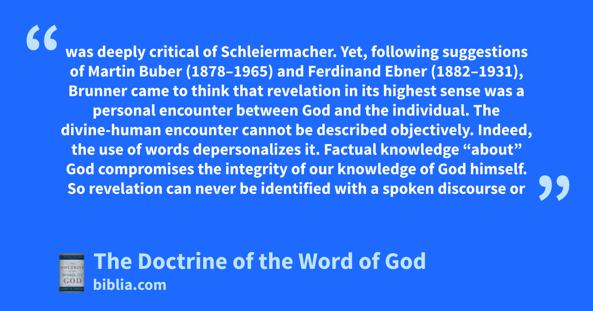 was deeply critical of Schleiermacher. Yet, following suggestions of Martin Buber (1878–1965) and Ferdinand Ebner (1882–1931), Brunner came to think that revelation in its highest sense was a personal encounter between God and the individual. The divine-human encounter cannot be described objectively. Indeed, the use of words depersonalizes it. Factual knowledge “about” God compromises the integrity of our knowledge of God himself. So revelation can never be identified with a spoken discourse or