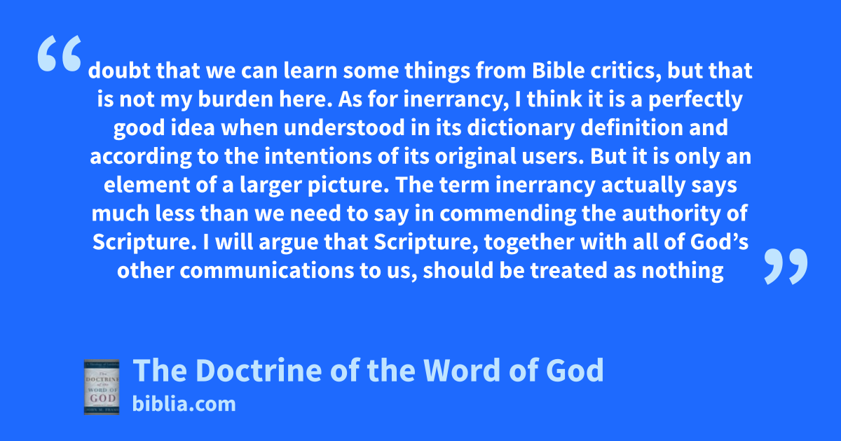 doubt that we can learn some things from Bible critics, but that is not my burden here. As for inerrancy, I think it is a perfectly good idea when understood in its dictionary definition and according to the intentions of its original users. But it is only an element of a larger picture. The term inerrancy actually says much less than we need to say in commending the authority of Scripture. I will argue that Scripture, together with all of God’s other communications to us, should be treated as nothing