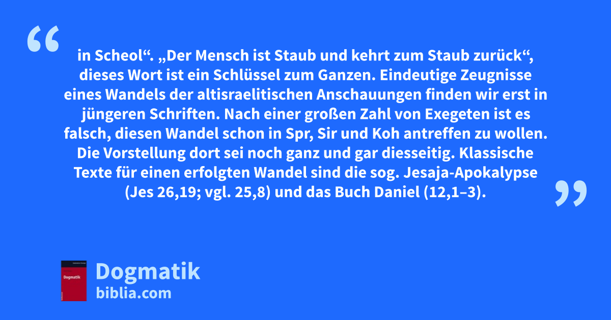 in Scheol“. „Der Mensch ist Staub und kehrt zum Staub zurück“, dieses Wort ist ein Schlüssel zum Ganzen. Eindeutige Zeugnisse eines Wandels der altisraelitischen Anschauungen finden wir erst in jüngeren Schriften. Nach einer großen Zahl von Exegeten ist es falsch, diesen Wandel schon in Spr, Sir und Koh antreffen zu wollen. Die Vorstellung dort sei noch ganz und gar diesseitig. Klassische Texte für einen erfolgten Wandel sind die sog. Jesaja-Apokalypse (Jes 26,19; vgl. 25,8) und das Buch Daniel (12,1–3).
