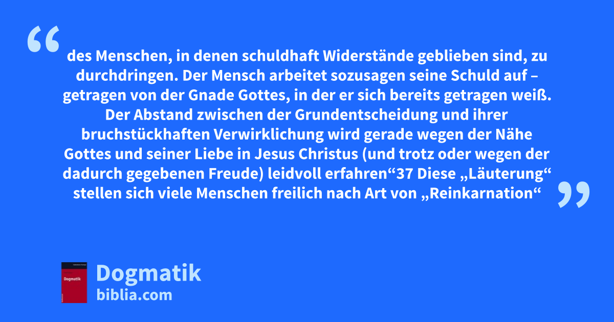 des Menschen, in denen schuldhaft Widerstände geblieben sind, zu durchdringen. Der Mensch arbeitet sozusagen seine Schuld auf – getragen von der Gnade Gottes, in der er sich bereits getragen weiß. Der Abstand zwischen der Grundentscheidung und ihrer bruchstückhaften Verwirklichung wird gerade wegen der Nähe Gottes und seiner Liebe in Jesus Christus (und trotz oder wegen der dadurch gegebenen Freude) leidvoll erfahren“37 Diese „Läuterung“ stellen sich viele Menschen freilich nach Art von „Reinkarnation“