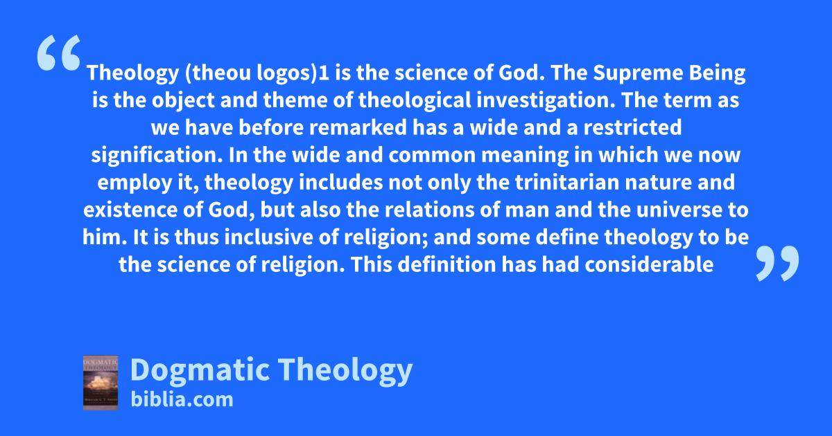 Theology (theou logos)1 is the science of God. The Supreme Being is the object and theme of theological investigation. The term as we have before remarked has a wide and a restricted signification. In the wide and common meaning in which we now employ it, theology includes not only the trinitarian nature and existence of God, but also the relations of man and the universe to him. It is thus inclusive of religion; and some define theology to be the science of religion. This definition has had considerable