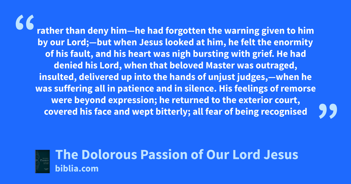 rather than deny him—he had forgotten the warning given to him by our Lord;—but when Jesus looked at him, he felt the enormity of his fault, and his heart was nigh bursting with grief. He had denied his Lord, when that beloved Master was outraged, insulted, delivered up into the hands of unjust judges,—when he was suffering all in patience and in silence. His feelings of remorse were beyond expression; he returned to the exterior court, covered his face and wept bitterly; all fear of being recognised