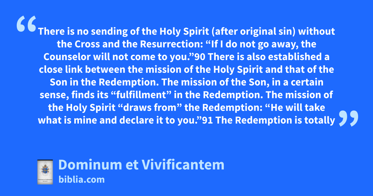 There is no sending of the Holy Spirit (after original sin) without the Cross and the Resurrection: “If I do not go away, the Counselor will not come to you.”90 There is also established a close link between the mission of the Holy Spirit and that of the Son in the Redemption. The mission of the Son, in a certain sense, finds its “fulfillment” in the Redemption. The mission of the Holy Spirit “draws from” the Redemption: “He will take what is mine and declare it to you.”91 The Redemption is totally