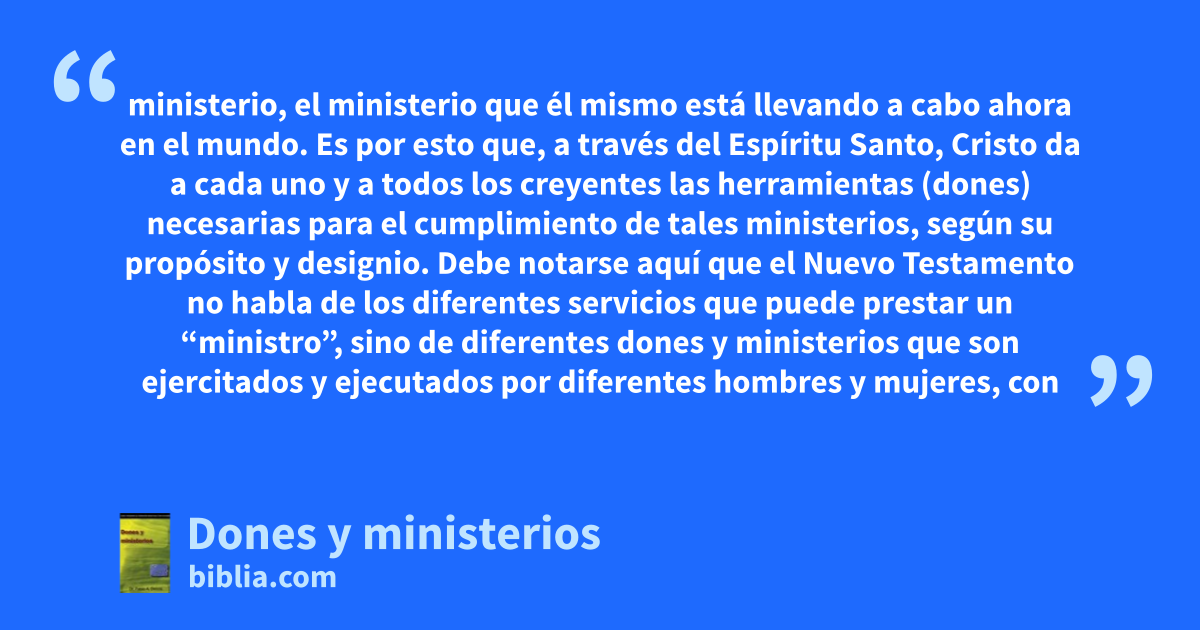 ministerio, el ministerio que él mismo está llevando a cabo ahora en el mundo. Es por esto que, a través del Espíritu Santo, Cristo da a cada uno y a todos los creyentes las herramientas (dones) necesarias para el cumplimiento de tales ministerios, según su propósito y designio. Debe notarse aquí que el Nuevo Testamento no habla de los diferentes servicios que puede prestar un “ministro”, sino de diferentes dones y ministerios que son ejercitados y ejecutados por diferentes hombres y mujeres, con