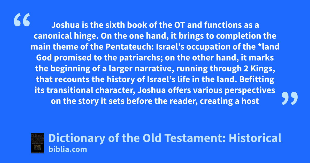 Joshua is the sixth book of the OT and functions as a canonical hinge. On the one hand, it brings to completion the main theme of the Pentateuch: Israel’s occupation of the *land God promised to the patriarchs; on the other hand, it marks the beginning of a larger narrative, running through 2 Kings, that recounts the history of Israel’s life in the land. Befitting its transitional character, Joshua offers various perspectives on the story it sets before the reader, creating a host