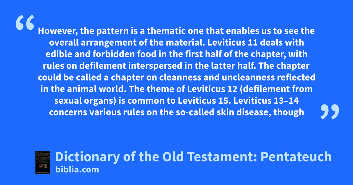 However, the pattern is a thematic one that enables us to see the overall arrangement of the material. Leviticus 11 deals with edible and forbidden food in the first half of the chapter, with rules on defilement interspersed in the latter half. The chapter could be called a chapter on cleanness and uncleanness reflected in the animal world. The theme of Leviticus 12 (defilement from sexual organs) is common to Leviticus 15. Leviticus 13–14 concerns various rules on the so-called skin disease, though