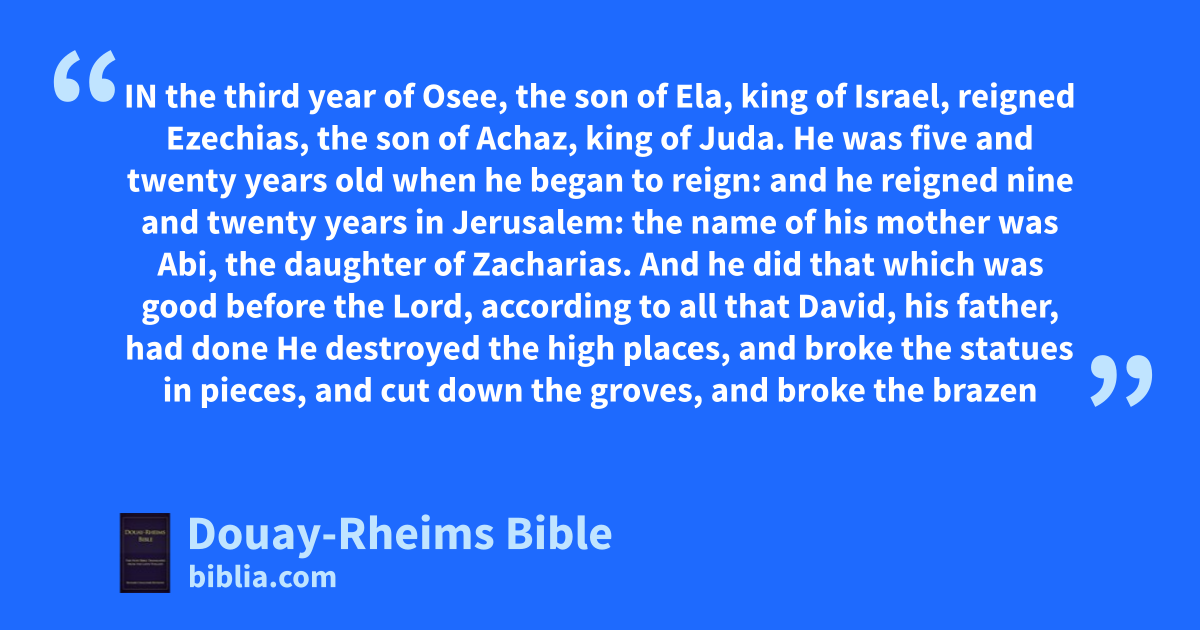 In the third year of Osee, the son of Ela, king of Israel, reigned Ezechias, the son of Achaz, king of Juda.