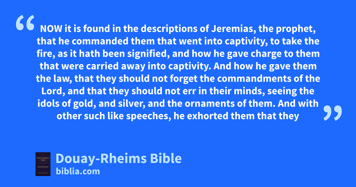 Now it is found in the descriptions of Jeremias, the prophet, that he commanded them that went into captivity, to take the fire, as it hath been signified, and how he gave charge to them that were carried away into captivity.