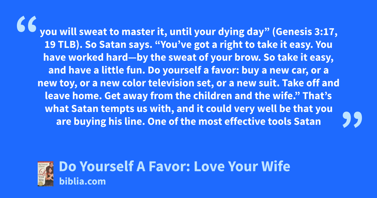 you will sweat to master it, until your dying day” (Genesis 3:17, 19 TLB). So Satan says. “You’ve got a right to take it easy. You have worked hard—by the sweat of your brow. So take it easy, and have a little fun. Do yourself a favor: buy a new car, or a new toy, or a new color television set, or a new suit. Take off and leave home. Get away from the children and the wife.” That’s what Satan tempts us with, and it could very well be that you are buying his line. One of the most effective tools Satan
