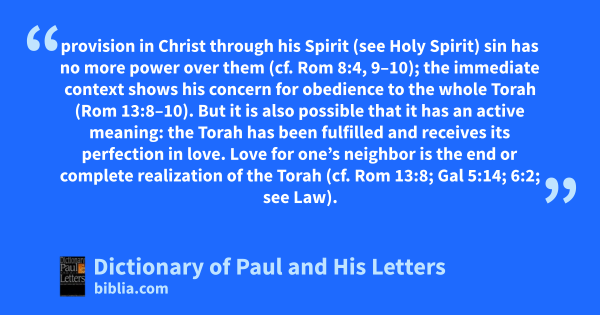 provision in Christ through his Spirit (see Holy Spirit) sin has no more power over them (cf. Rom 8:4, 9–10); the immediate context shows his concern for obedience to the whole Torah (Rom 13:8–10). But it is also possible that it has an active meaning: the Torah has been fulfilled and receives its perfection in love. Love for one’s neighbor is the end or complete realization of the Torah (cf. Rom 13:8; Gal 5:14; 6:2; see Law).