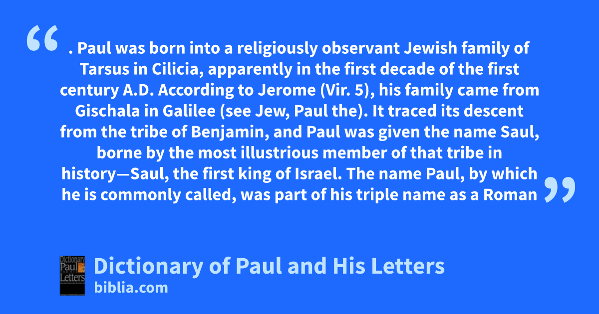 . Paul was born into a religiously observant Jewish family of Tarsus in Cilicia, apparently in the first decade of the first century A.D. According to Jerome (Vir. 5), his family came from Gischala in Galilee (see Jew, Paul the). It traced its descent from the tribe of Benjamin, and Paul was given the name Saul, borne by the most illustrious member of that tribe in history—Saul, the first king of Israel. The name Paul, by which he is commonly called, was part of his triple name as a Roman