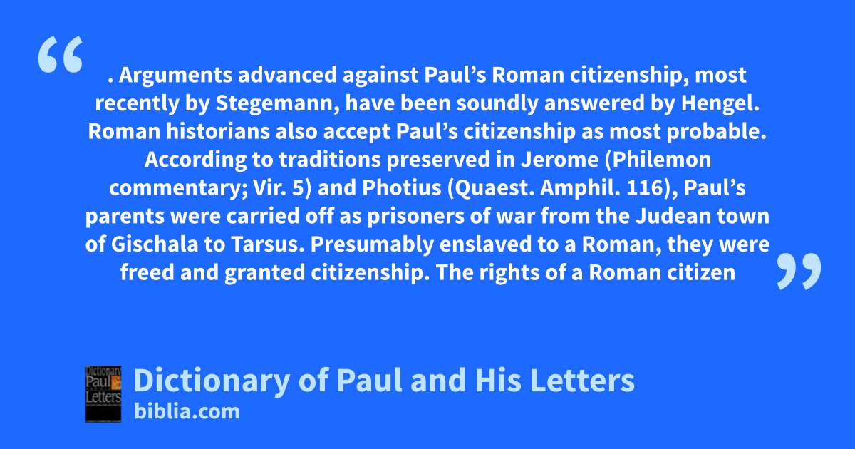 . Arguments advanced against Paul’s Roman citizenship, most recently by Stegemann, have been soundly answered by Hengel. Roman historians also accept Paul’s citizenship as most probable. According to traditions preserved in Jerome (Philemon commentary; Vir. 5) and Photius (Quaest. Amphil. 116), Paul’s parents were carried off as prisoners of war from the Judean town of Gischala to Tarsus. Presumably enslaved to a Roman, they were freed and granted citizenship. The rights of a Roman citizen