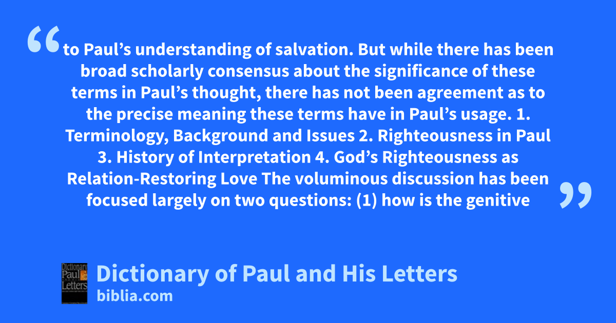 to Paul’s understanding of salvation. But while there has been broad scholarly consensus about the significance of these terms in Paul’s thought, there has not been agreement as to the precise meaning these terms have in Paul’s usage. 1. Terminology, Background and Issues 2. Righteousness in Paul 3. History of Interpretation 4. God’s Righteousness as Relation-Restoring Love The voluminous discussion has been focused largely on two questions: (1) how is the genitive