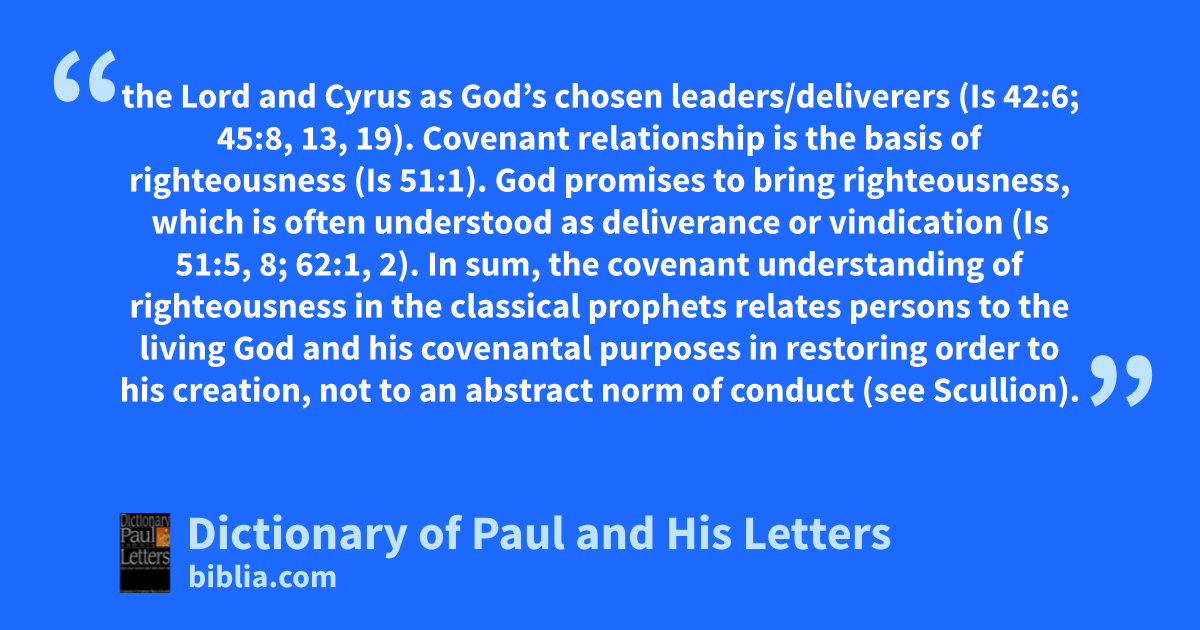 the Lord and Cyrus as God’s chosen leaders/deliverers (Is 42:6; 45:8, 13, 19). Covenant relationship is the basis of righteousness (Is 51:1). God promises to bring righteousness, which is often understood as deliverance or vindication (Is 51:5, 8; 62:1, 2). In sum, the covenant understanding of righteousness in the classical prophets relates persons to the living God and his covenantal purposes in restoring order to his creation, not to an abstract norm of conduct (see Scullion).